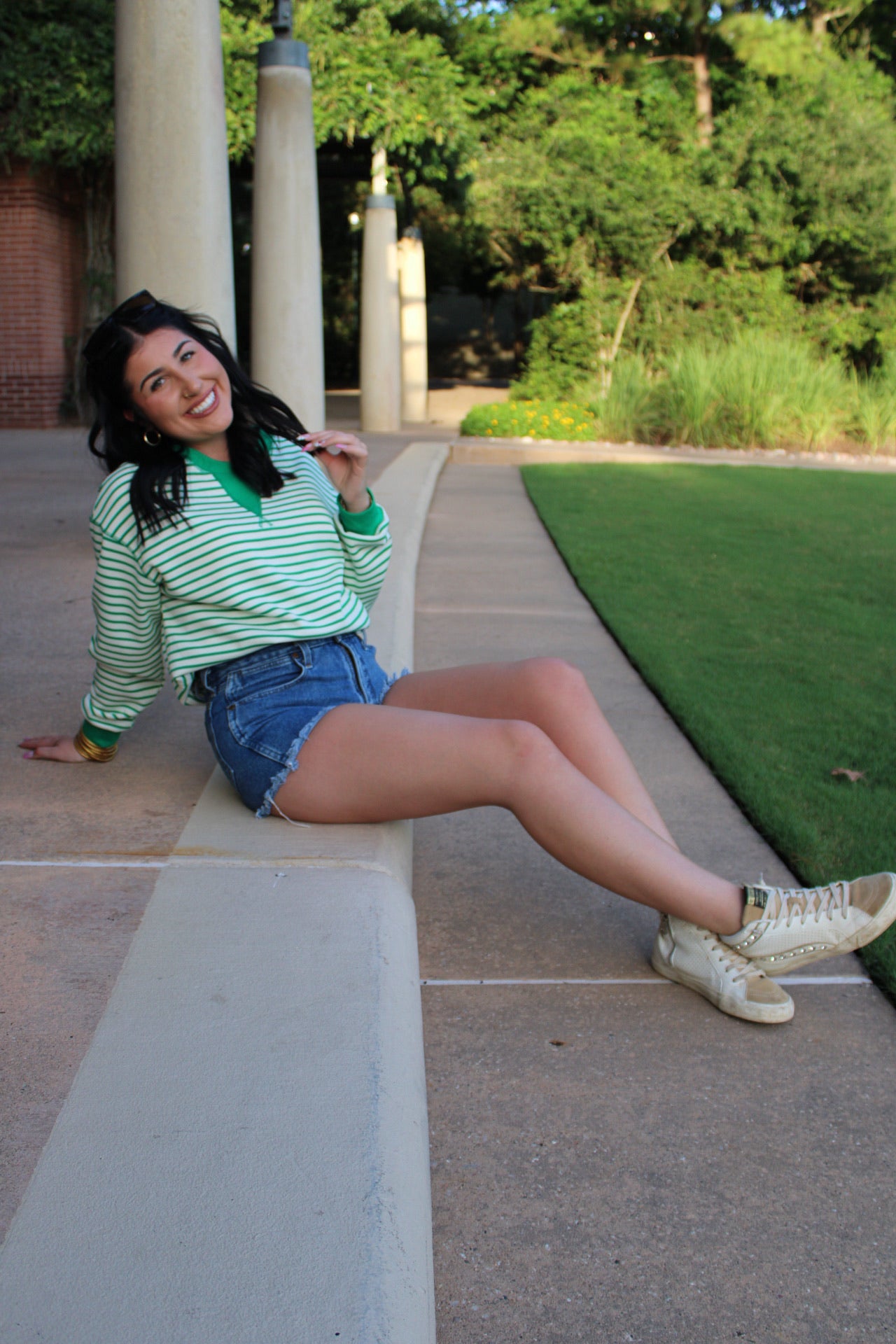 The Greenlight Pullover brings, fresh, sporty vibes with its crisp green and white stripes and bold contrast collar. This lightweight long sleeve is perfect for cool mornings or laid-back afternoons-just throw it on with denim shorts for an easy, eye catching look.