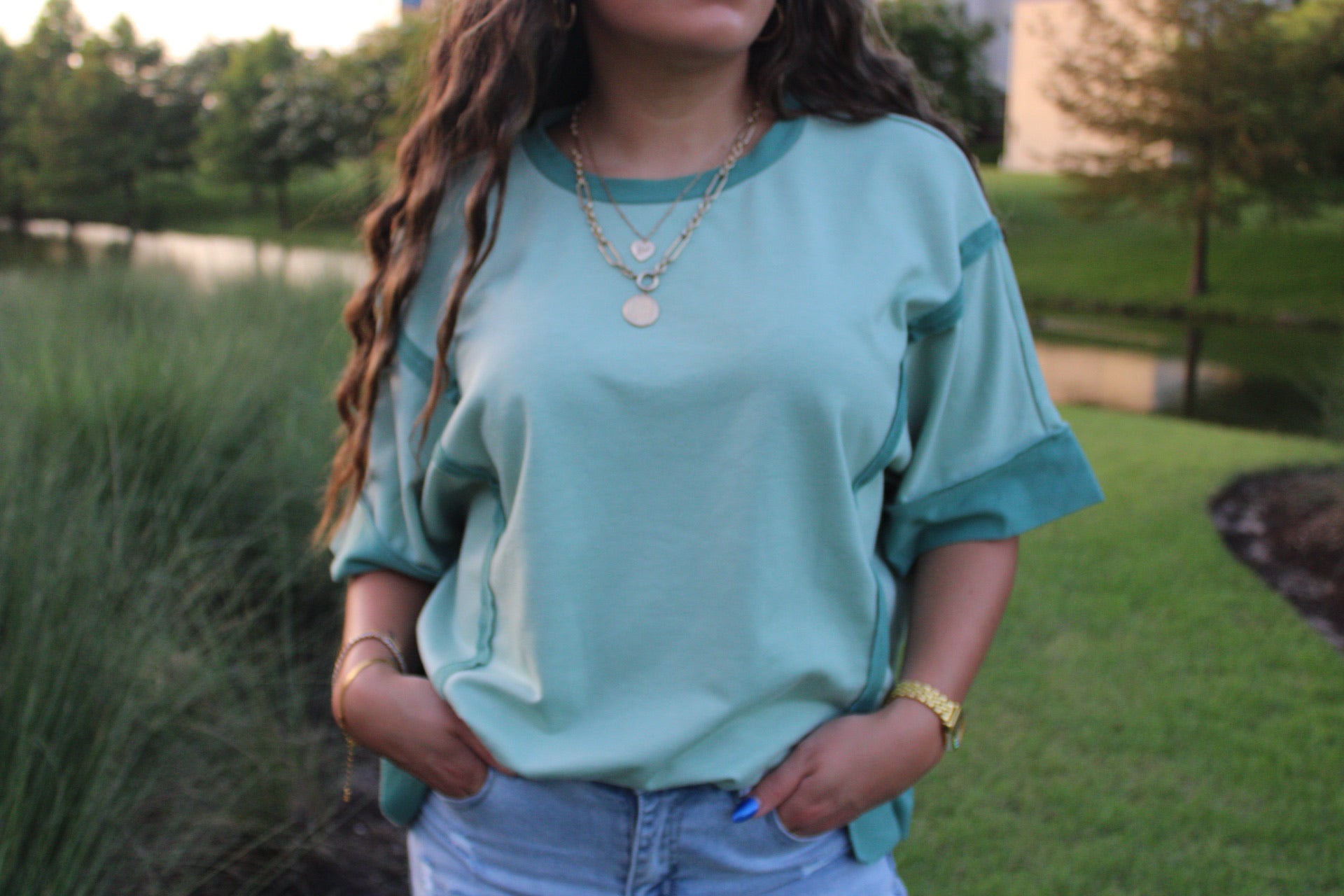 The shirt in the image is a relaxed-fit, in a soft teal or light seafoam green color. It has a slightly boxy silhouette with dropped shoulders and wide sleeves, giving it a casual yet elevated feel. The fabric has a subtle sheen, which adds a touch of sophistication. It's styled with a tucked-in front and left untucked in the back, emphasizing a laid-back but stylish vibe. Perfect for both day outings and dressed-up casual looks.