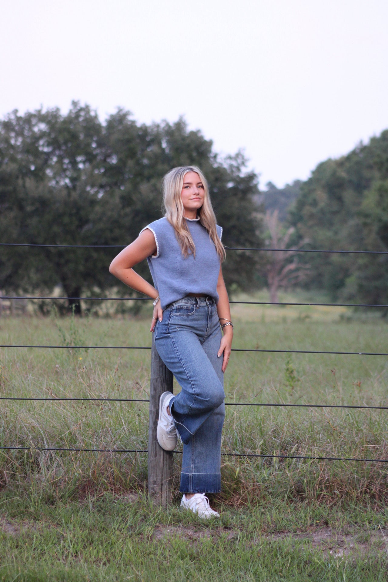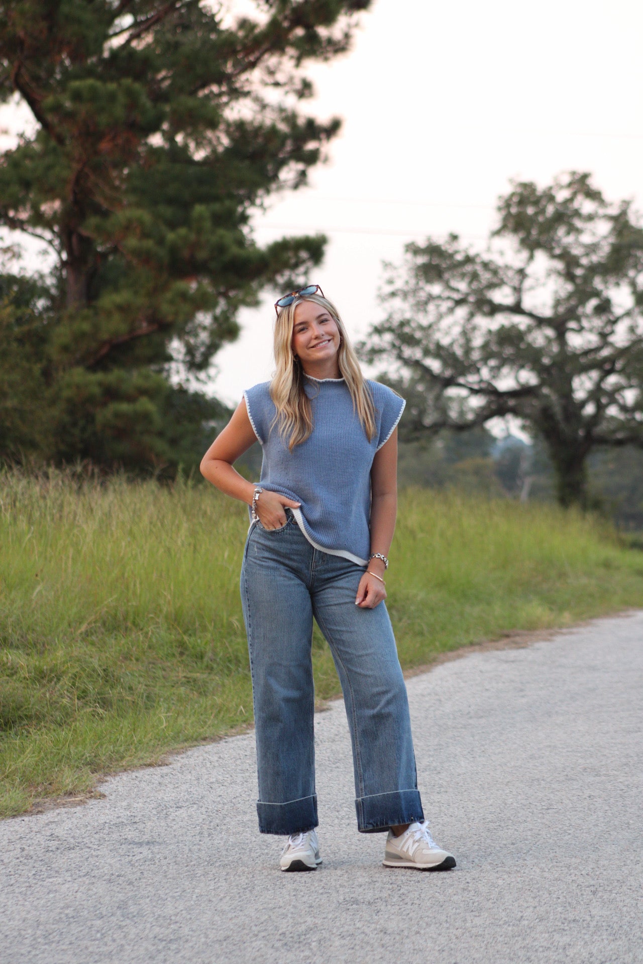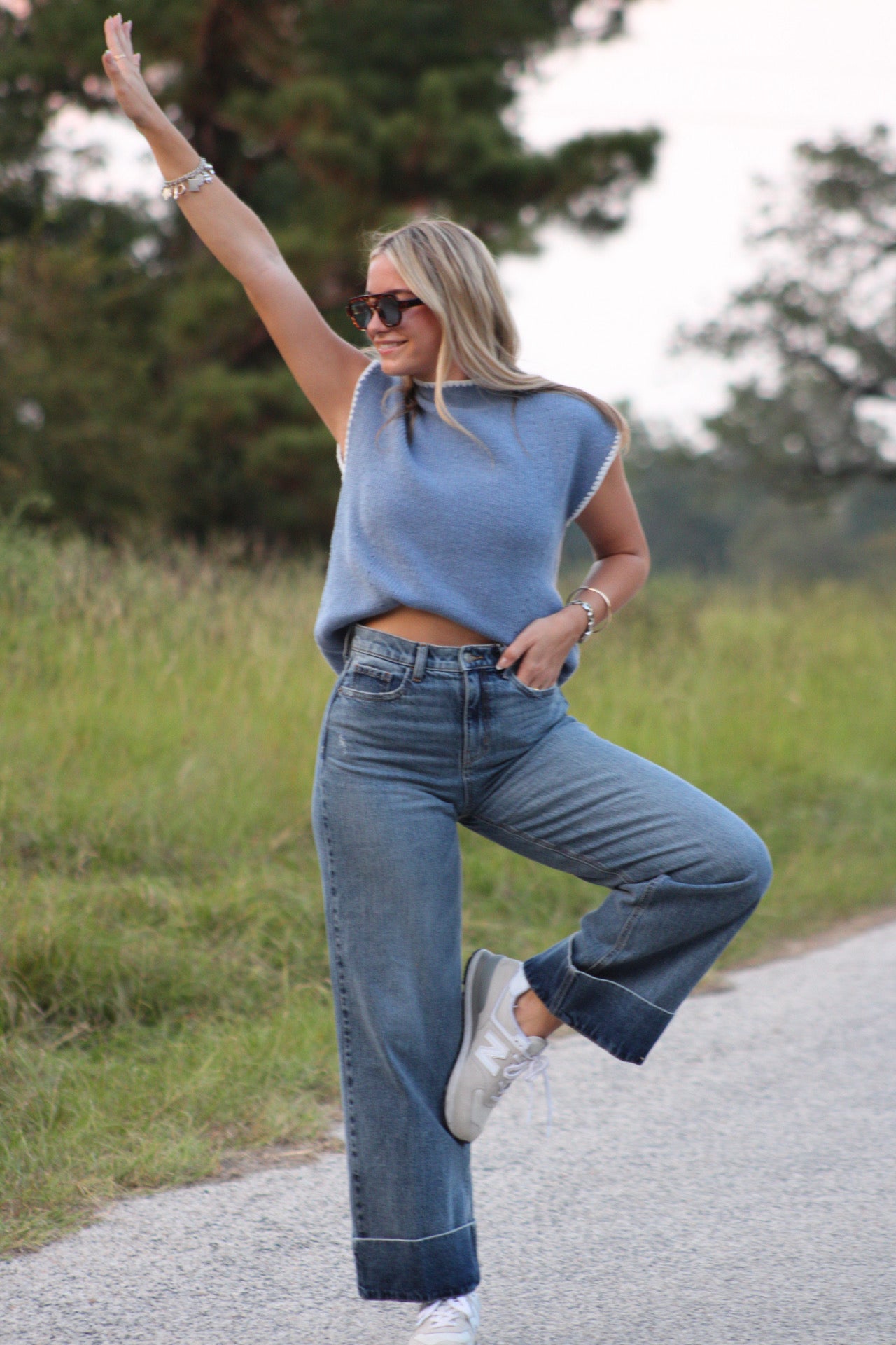 A fresh fall staple, this denim ribbed knit top features a relaxed mock neckline with contrast scalloped trim along the cap sleeves. Decorative seam details run down the front and back for added texture, while the wavy white-trimmed hemline gives it a playful yet polished finish — perfect for layering into your fall wardrobe.