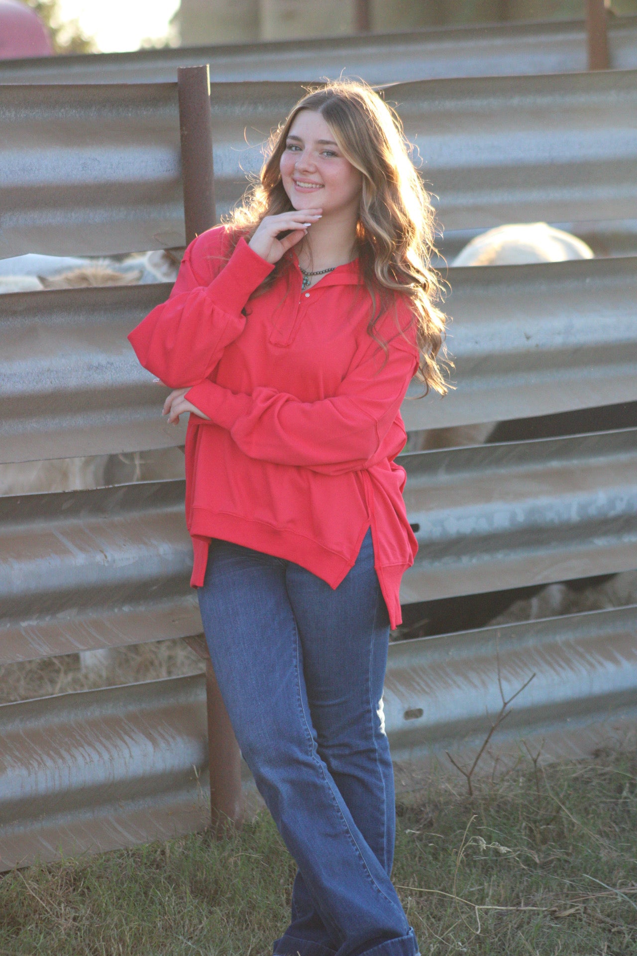Sporty, bold, and effortlessly cozy — the Red Velvet Sweatshirt is your go-to for that laid-back, on-the-go look. Featuring an oversized fit, soft interior, and quarter-zip neckline, it’s perfect for tossing on with biker shorts, leggings, or jeans. Whether you’re heading to class, running errands, or lounging in style, this sweatshirt brings the perfect mix of comfort and confidence.